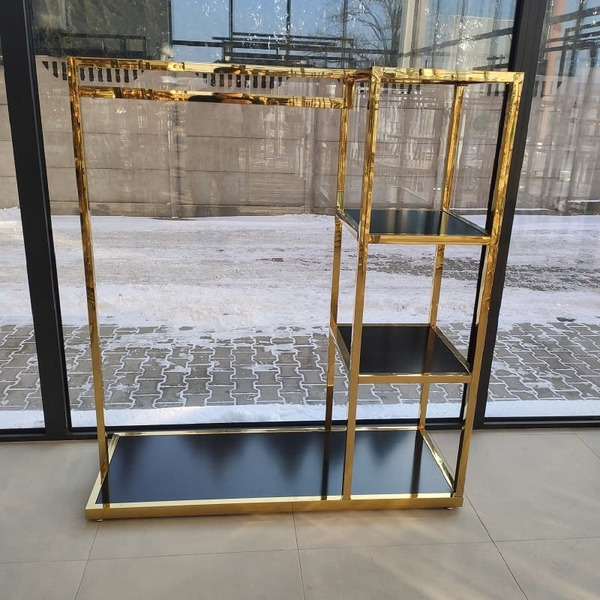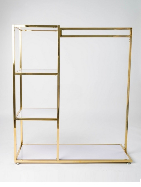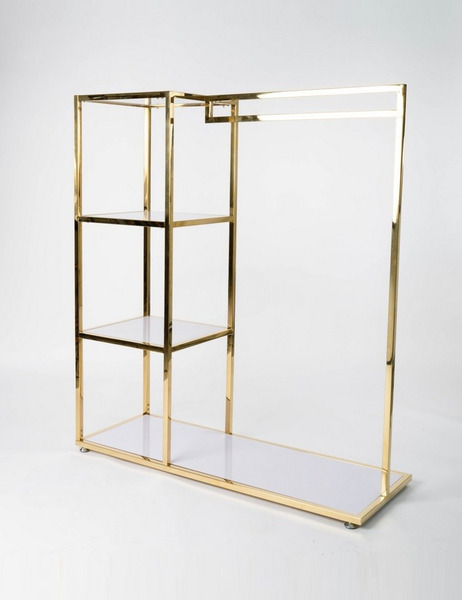 Zelta krāsas drēbju pakaramais ar plauktiem. Garums: 120 cm