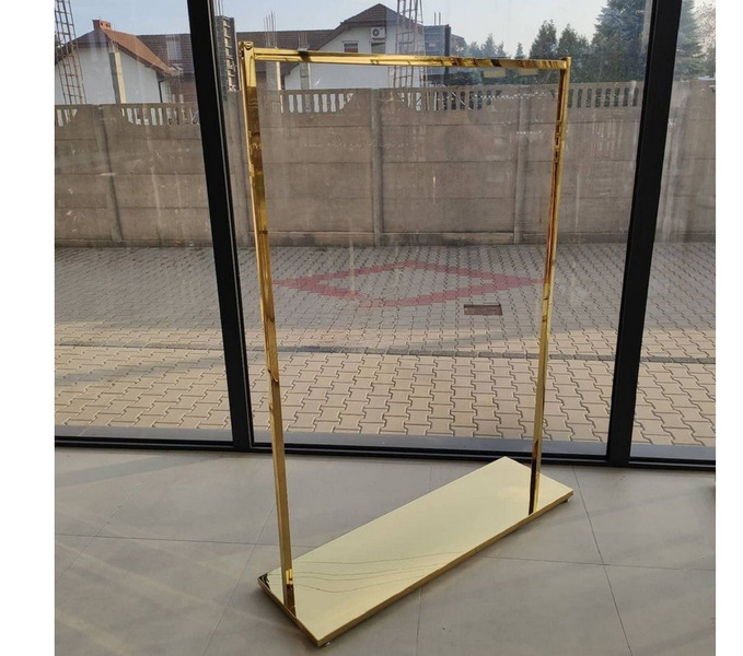Zelta krāsas mēteļu pakaramais ar plauktu apakšā. Materiāls: metāls, pārklāts ar zelta toni.